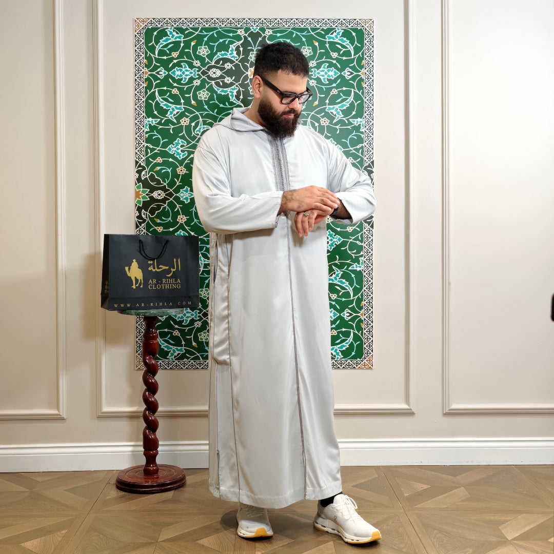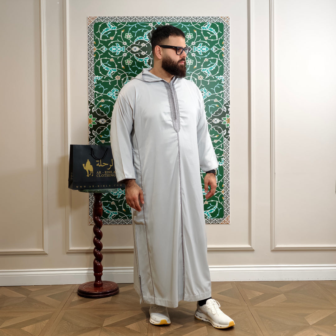 Our long sleeve hooded Moroccan thobe blends traditional design with modern comfort. Made from 185GSM premium gabardine fabric, it is lightweight yet durable, offering breathability and comfort across all seasons. The thobe features detailed embroidery along the front, cuffs, and seams, reflecting authentic Moroccan craftsmanship. A traditional hood adds cultural character, while two practical side pockets and a hidden front zip provide everyday convenience. Suitable for both daily wear and special occasions, this thobe combines timeless Moroccan style with functionality.